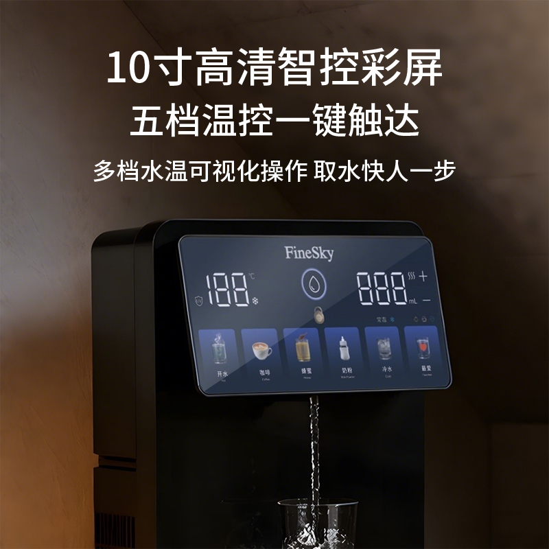适配净水器及桶装水 10寸高清智控彩屏 五档温控一键触达 新一代无热胆秒沸科技, 100℃沸水与15℃冰鲜水一键即享 双重安全防护体系 满足全家老幼多元需求